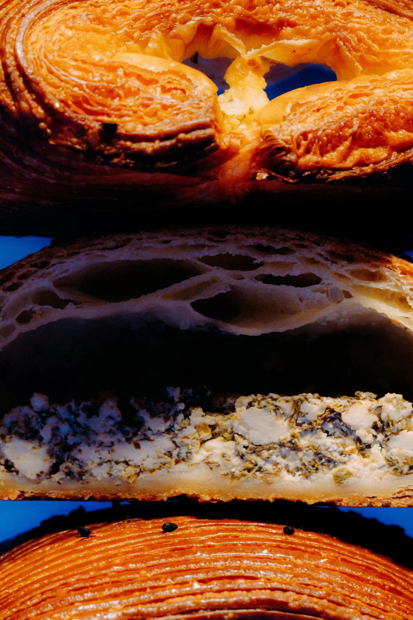 Close-up view of flaky pastries and viennoiserie from Dope Bakehouse