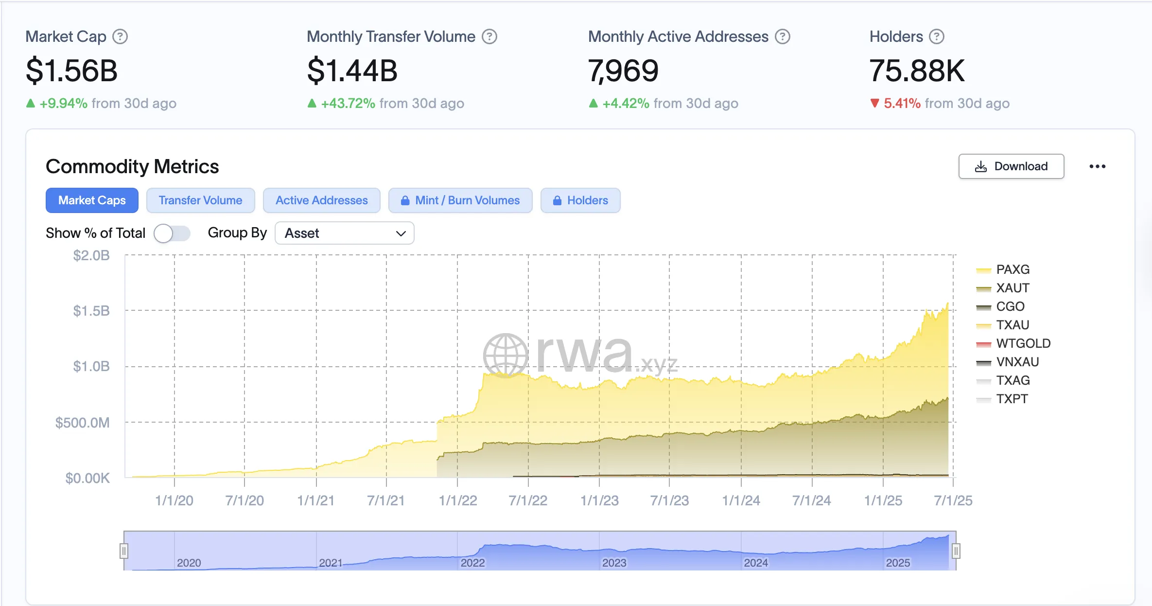 Chart showing the growth of tokenized commodity market capitalization, suggesting increasing interest in using assets like gold and real estate within the RWA space.