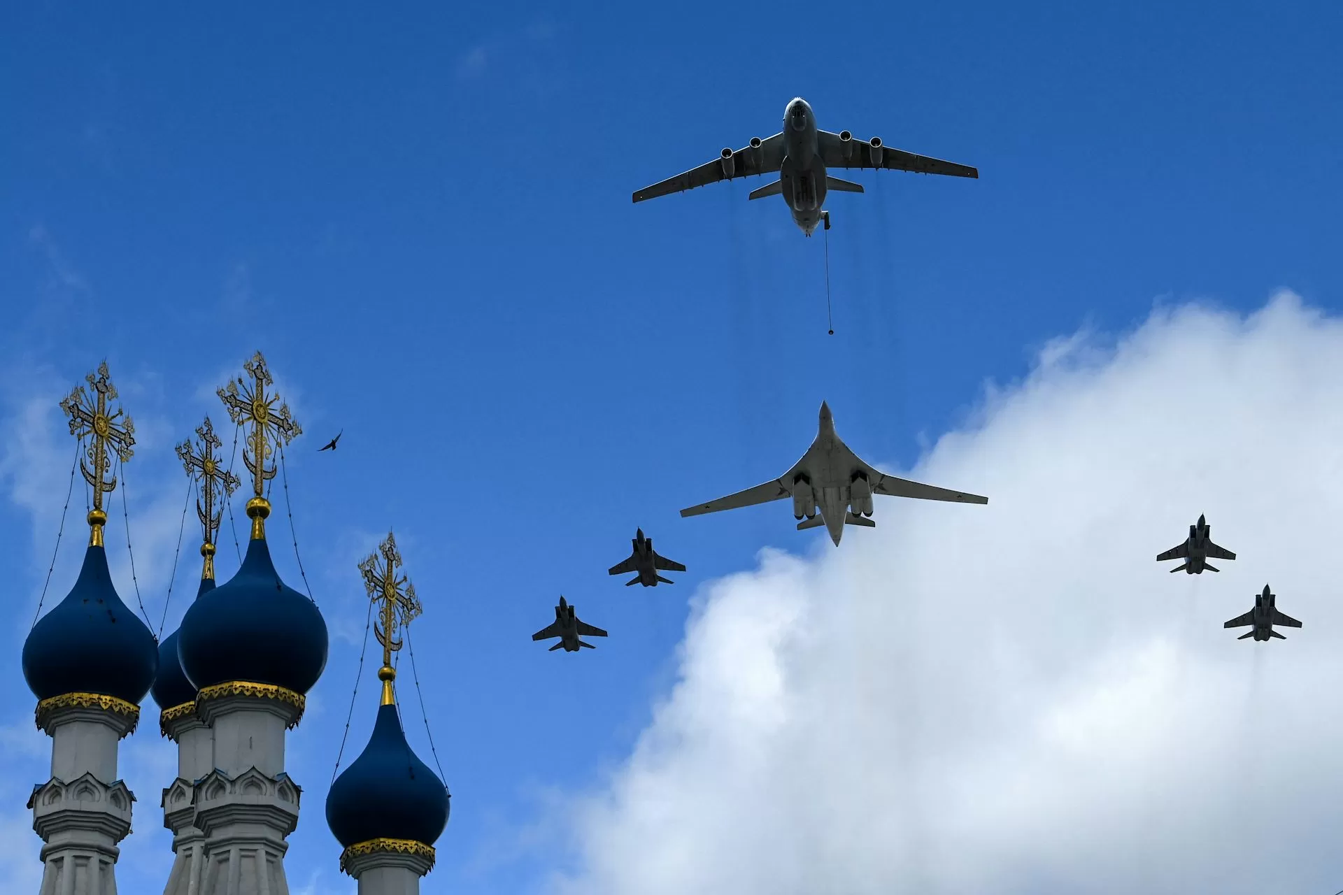 Avions de chasse russes MiG-31bm, un bombardier stratégique Tu-160 et un avion ravitailleur Il-78 survolant Moscou lors d'une répétition du défilé de la Victoire de la Seconde Guerre mondiale le 4 mai 2022.