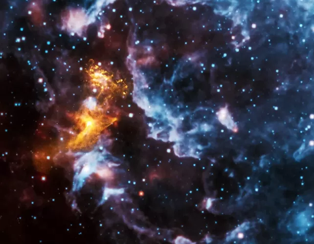 Image composite du pulsar PSR B1509-58 montrant les rayons X (or) de l'étoile à neutrons en rotation et la lumière infrarouge (rouge, vert, bleu) du matériel environnant.