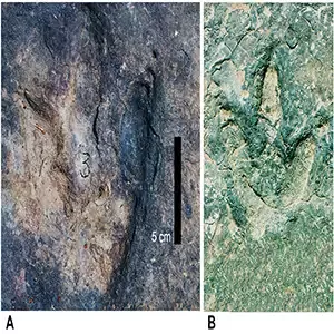 Deux empreintes fossiles distinctes à trois doigts de théropode dans la roche du bassin de Koum, Cameroun.