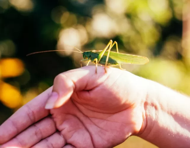 Une sauterelle posée sur une main humaine, illustrant la vie complexe qui dépend de l'oxygène