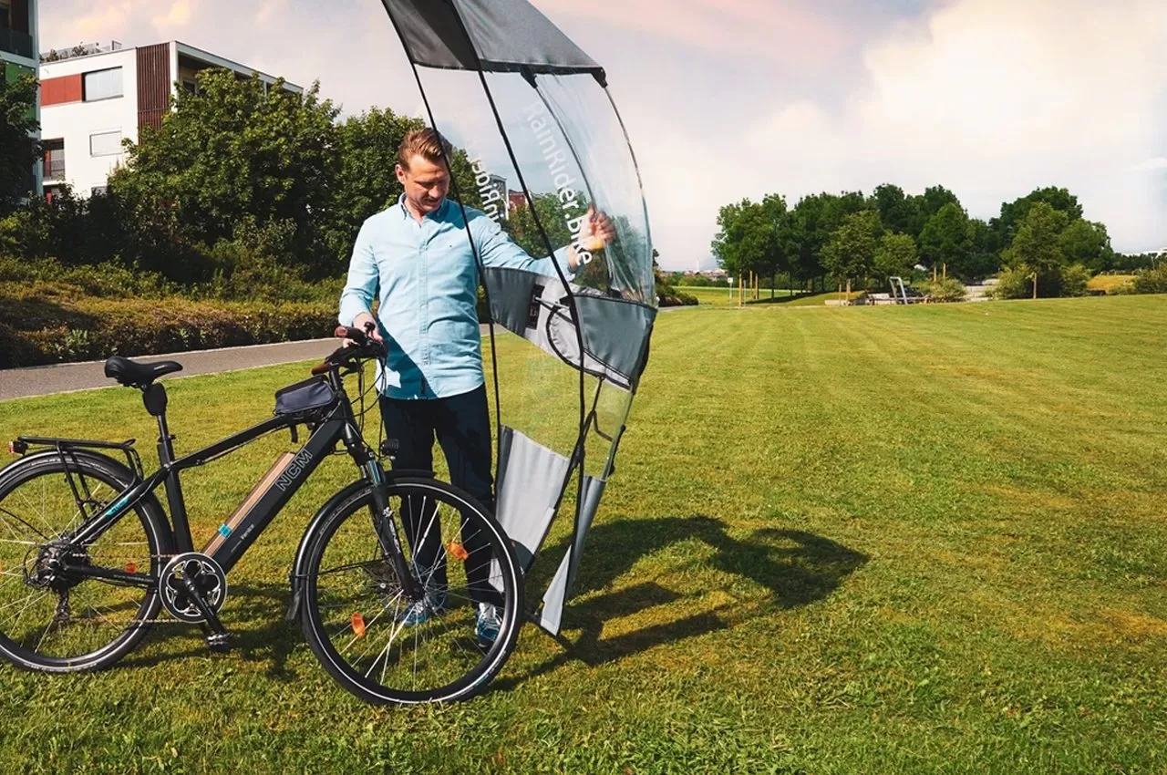 Housse transparente montée sur vélo offrant une protection contre la pluie et le vent