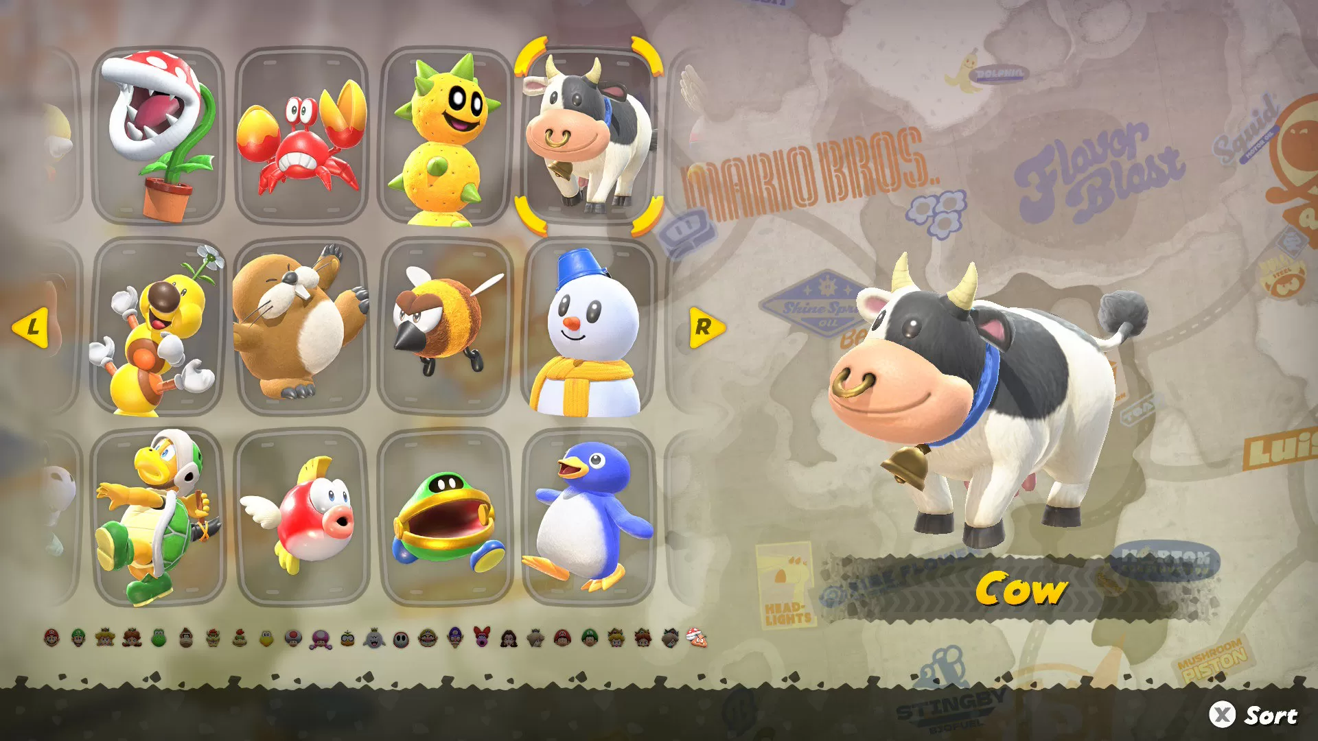 Un personnage distinctif de vache est mis en évidence sur l'écran de sélection des personnages dans Mario Kart World