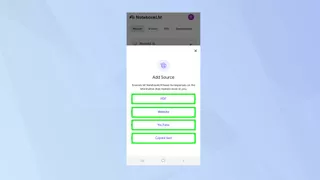 Interface mobile NotebookLM montrant les options pour ajouter des sources (documents, liens web)