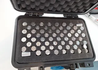 Six scientists in lab coats handing over a payload case at an aerospace facility