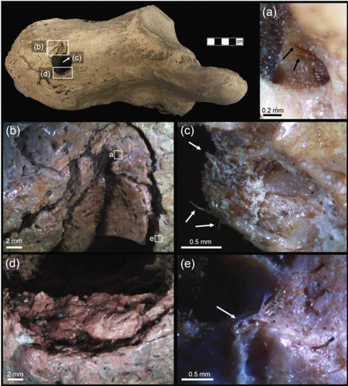 Microscopic view showing organic fibers and fractures on ancient sloth bone indentation