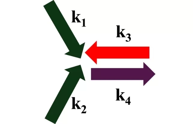 Simulation showing three beams interacting to scatter a fourth photonA 2D computer simulation illustrating how three incoming light waves could interact in a vacuum to produce a scattered fourth wave. Different colors represent hypothetical wavelengths.
