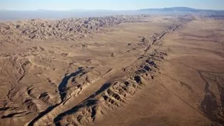 Aerial view of the San Andreas Fault line carving through a landscape, illustrating the massive geological feature responsible for California's earthquake risk.