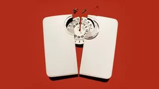 Illustration of a broken bathroom scale against a red background, symbolizing challenges related to weight, mental health, and stigma often associated with weight loss journeys.