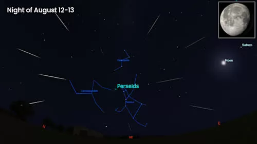 Simulation showing the radiant point of the Perseid meteor shower in the constellation Perseus, with the moon phase inset.
