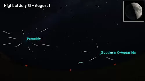 Simulation showing the radiant points for both the Southern Delta Aquariid and Perseid meteor showers active simultaneously in the night sky.