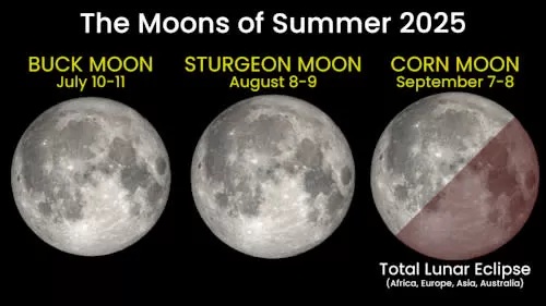 Visual representation of the three average-sized full moons appearing during Summer 2025: Buck, Sturgeon, and Corn moons.