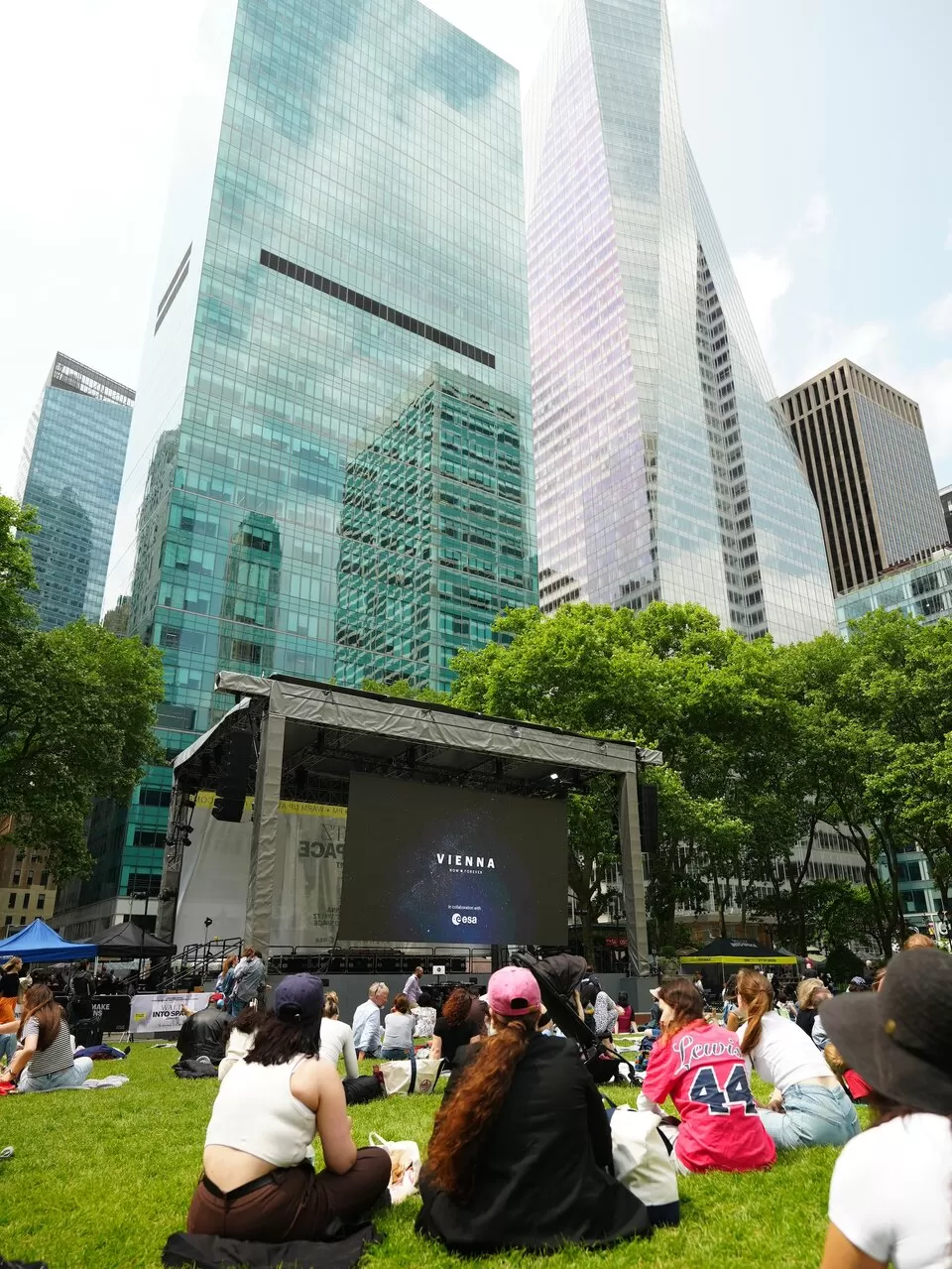 People gather to watch a large screen showing the concert event in Bryant Park, New York City