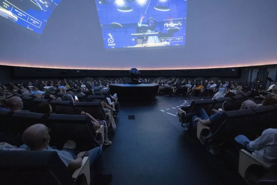 People watch a screen showing the concert event at the Madrid Planetarium