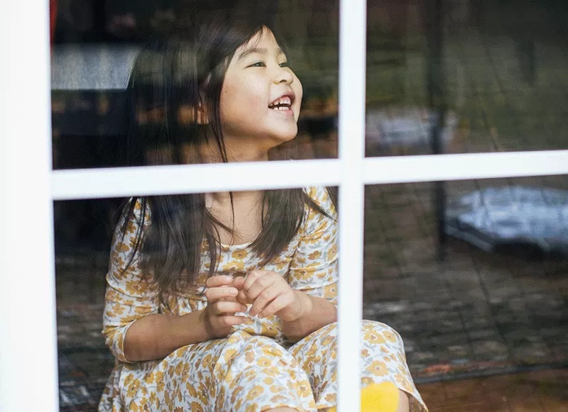 A young girl with long dark hair, wearing a yellow and white floral dress, sits smiling and looking up while behind a window with white grid panes. Reflections and outdoor scenery are visible on the glass.