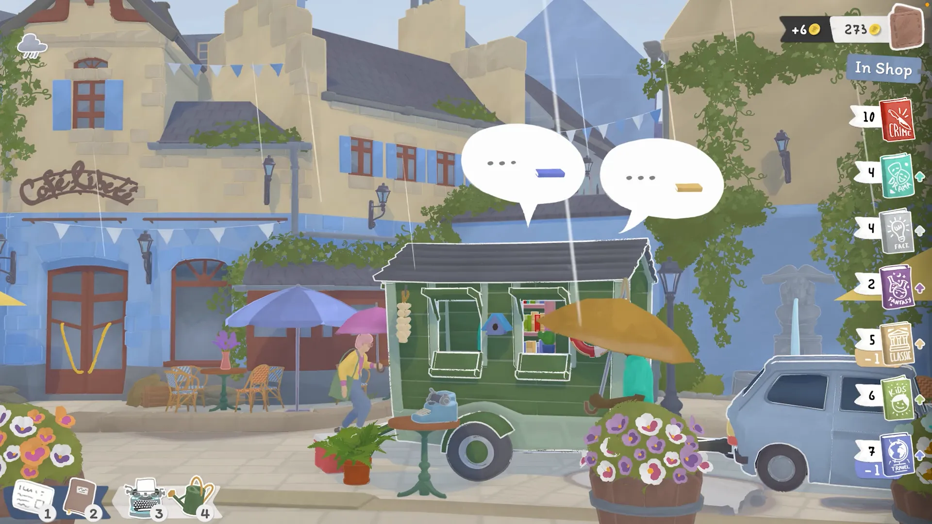 Screenshot from the relaxing simulation game Tiny Bookshop featuring a mobile bookstore and cafe.