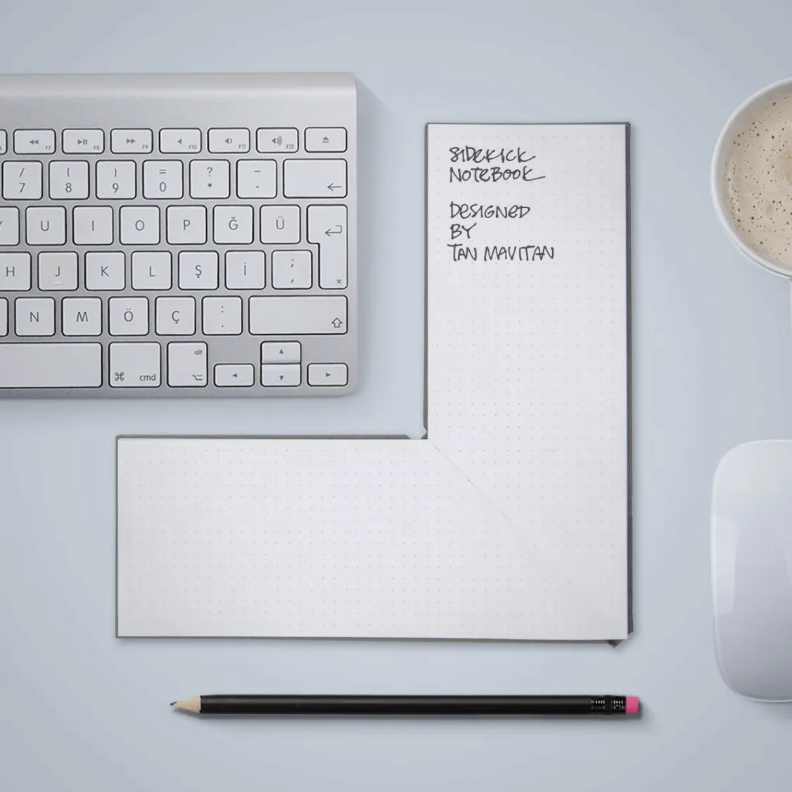 The L-shaped Sidekick Notebook positioned next to a computer keyboard on a desk.