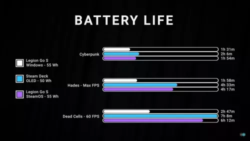 Chart comparing battery life on Legion Go S (Windows), Legion Go S (SteamOS), and other devices
