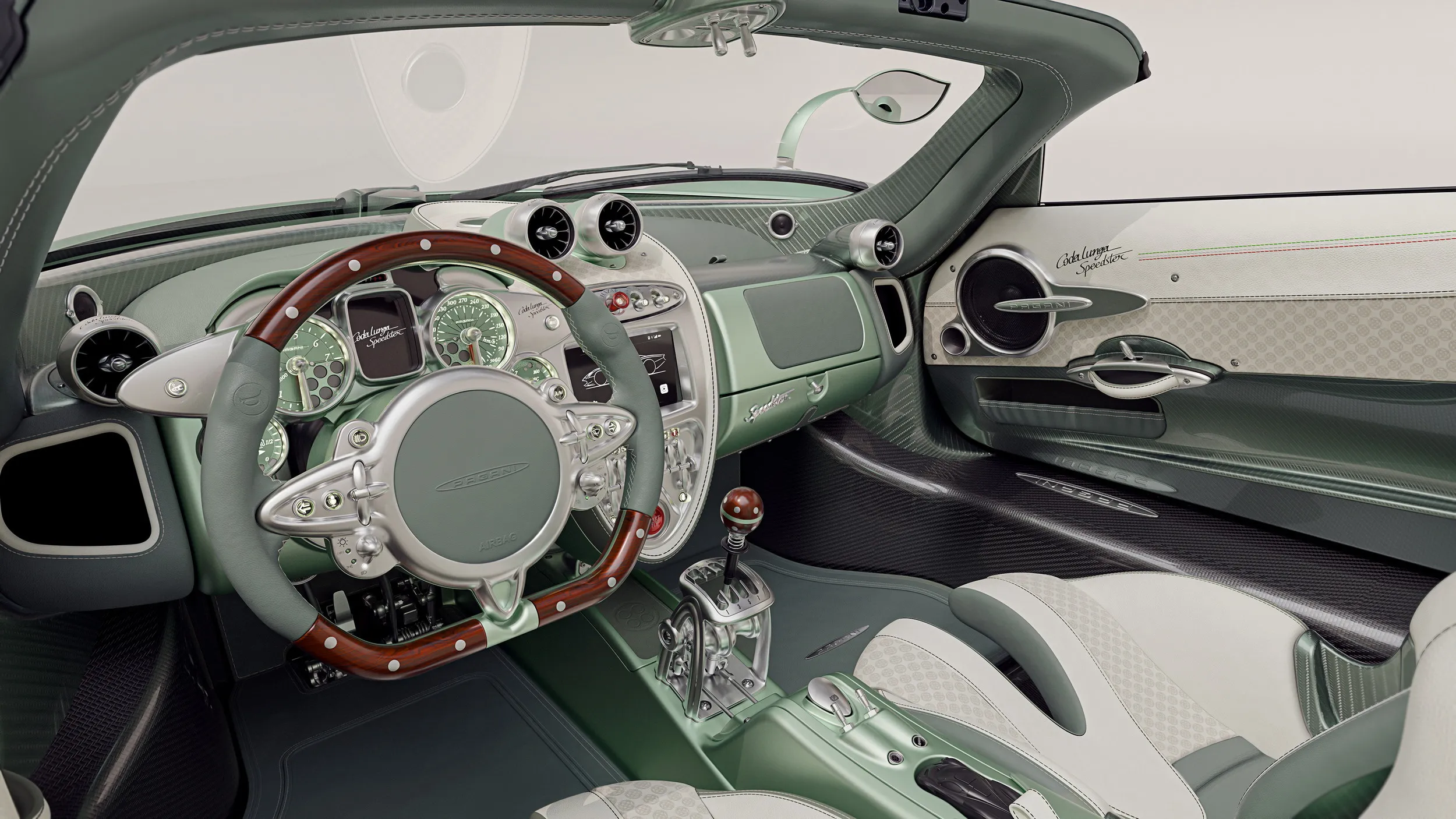 Detailed interior view of the Pagani Huayra Codalunga Speedster cabin with classic materials.