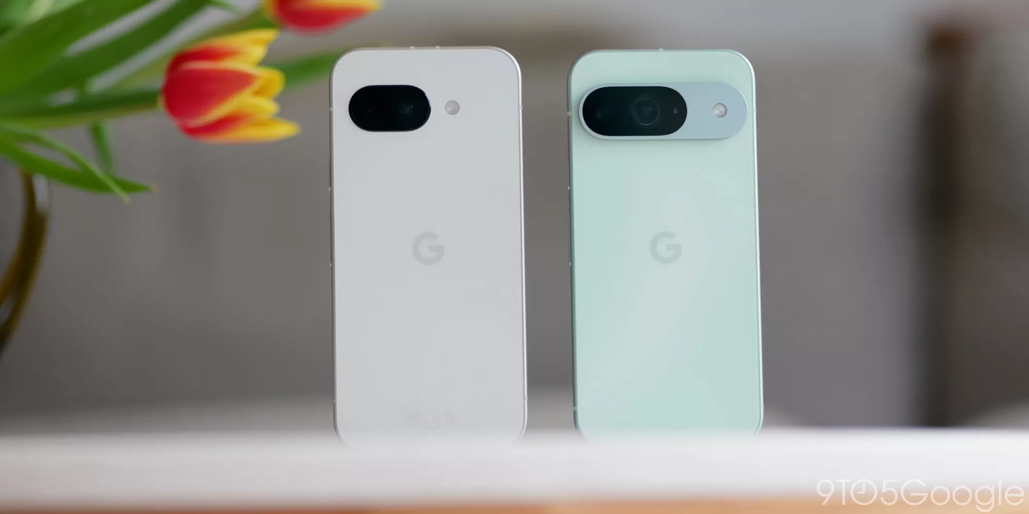 Comparison of Google Pixel 9a and Pixel 9 phones in Porcelain white and Wintergreen