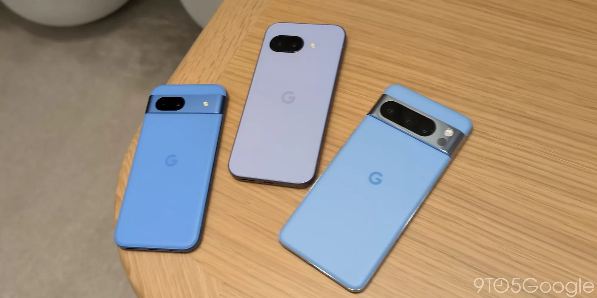 Google logo displayed on a Pixel 9a phone screen next to other Pixel phones