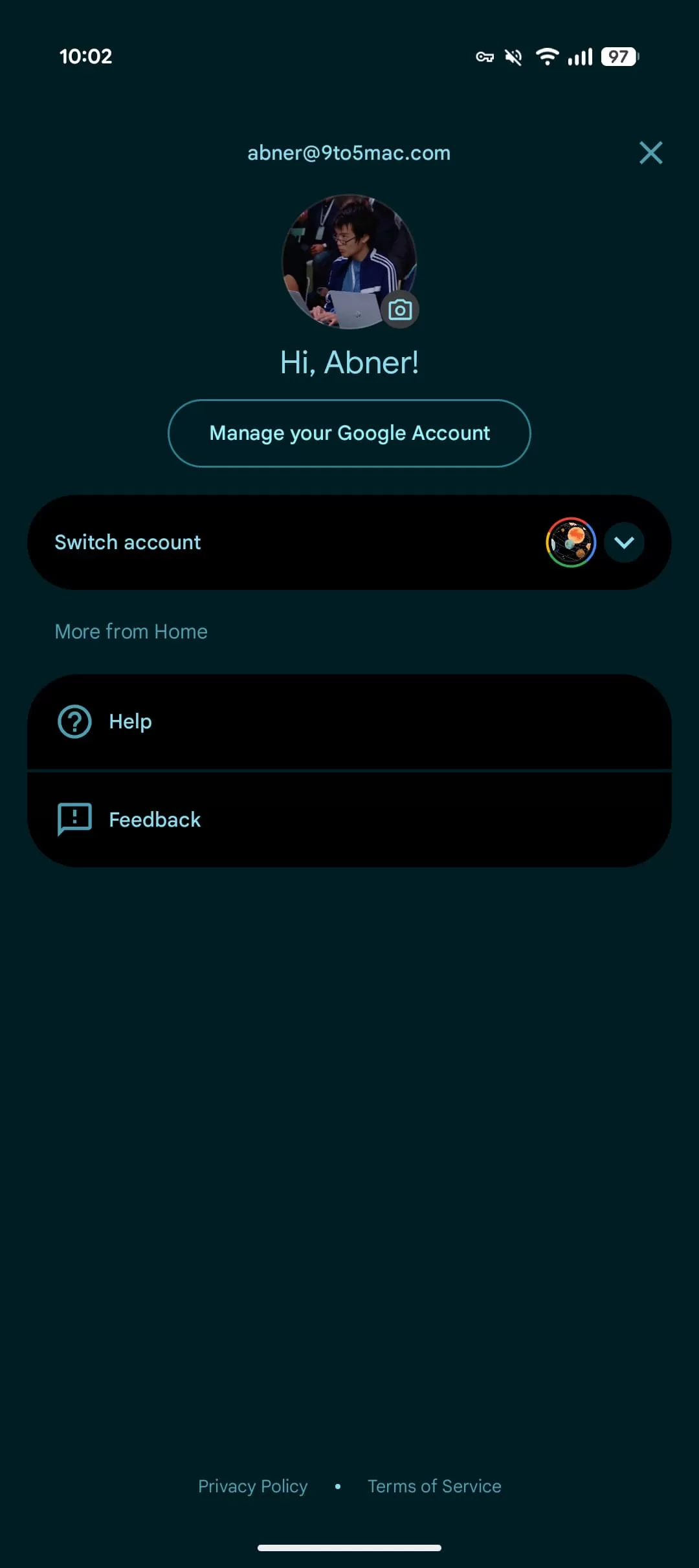 The new fullscreen Google Account switcher in the Google Home app, showing additional app-specific menu options