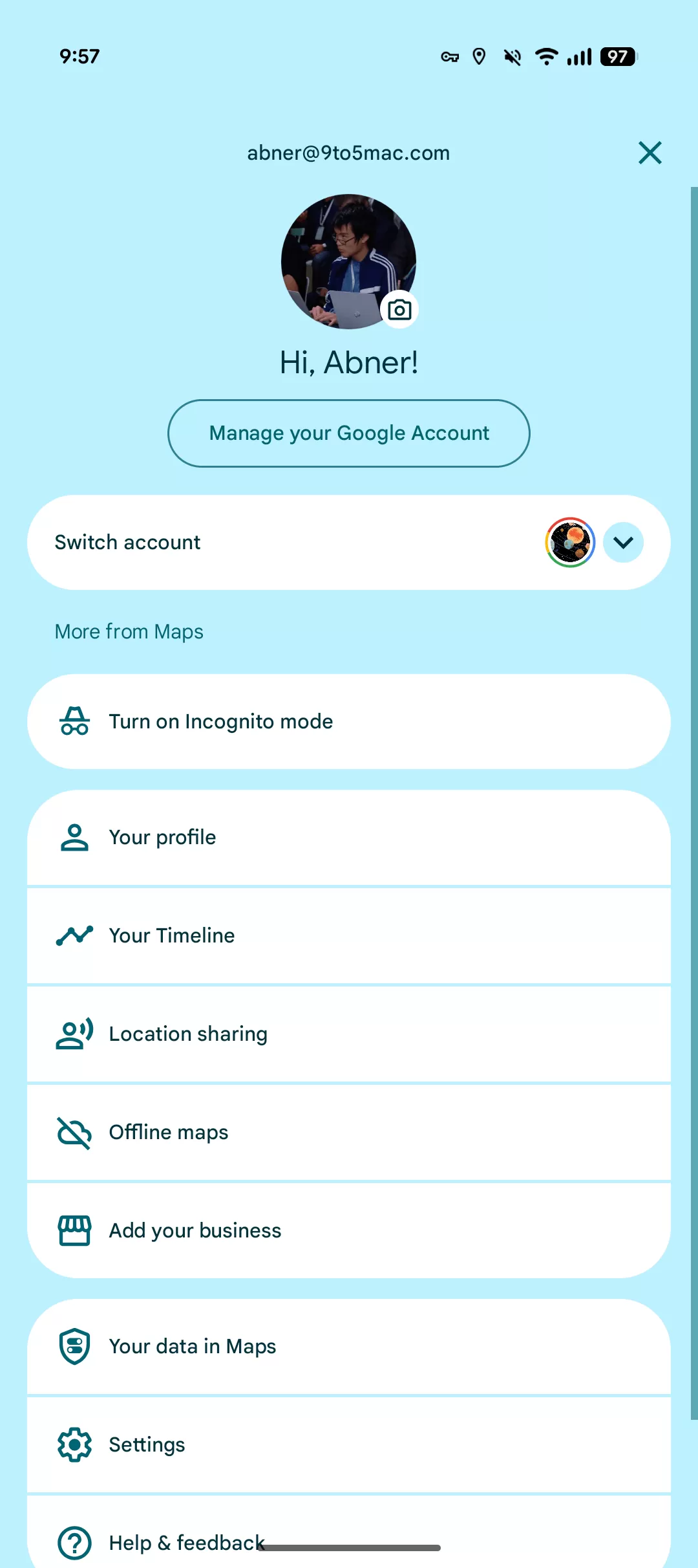 Example of the updated fullscreen Google Account switcher interface in Google Maps, featuring a large profile avatar and account details