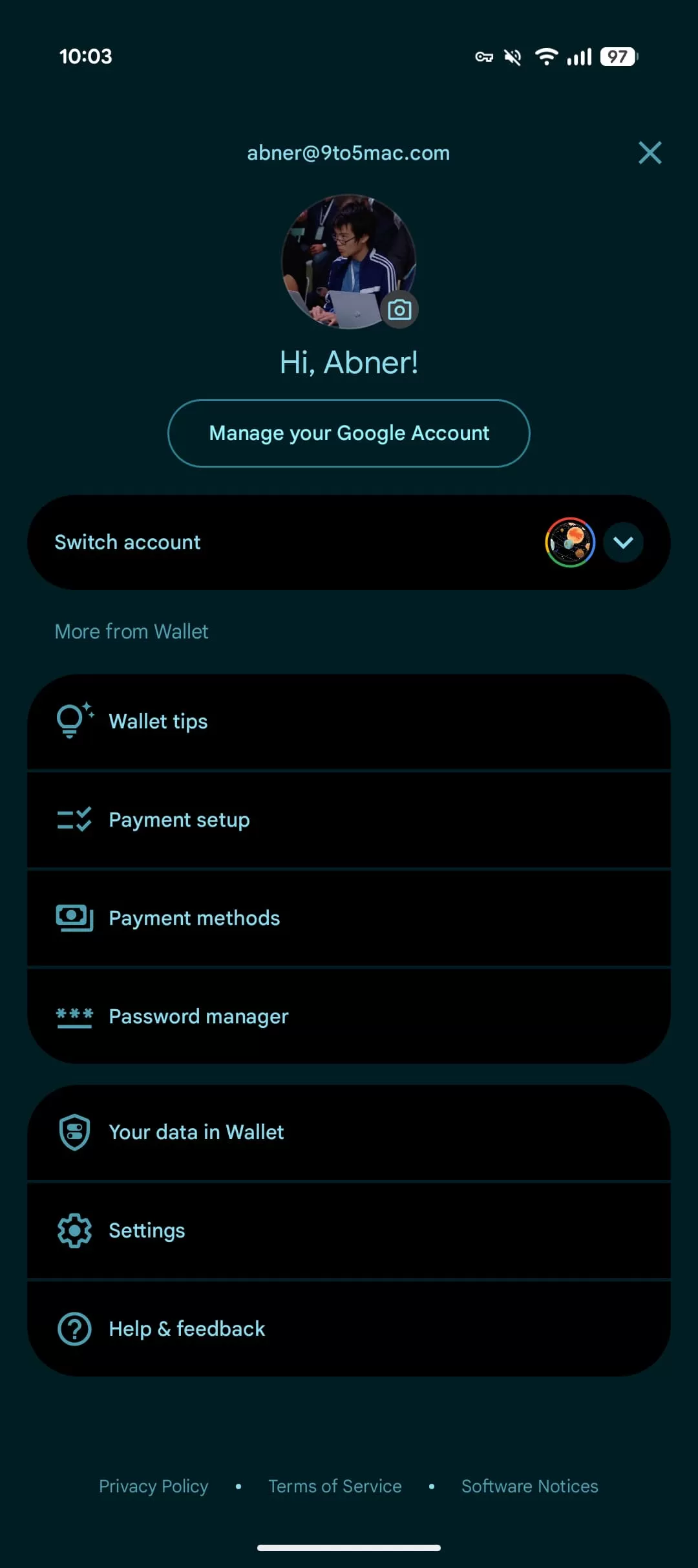 View of the redesigned fullscreen Google Account switcher in the Google Wallet app