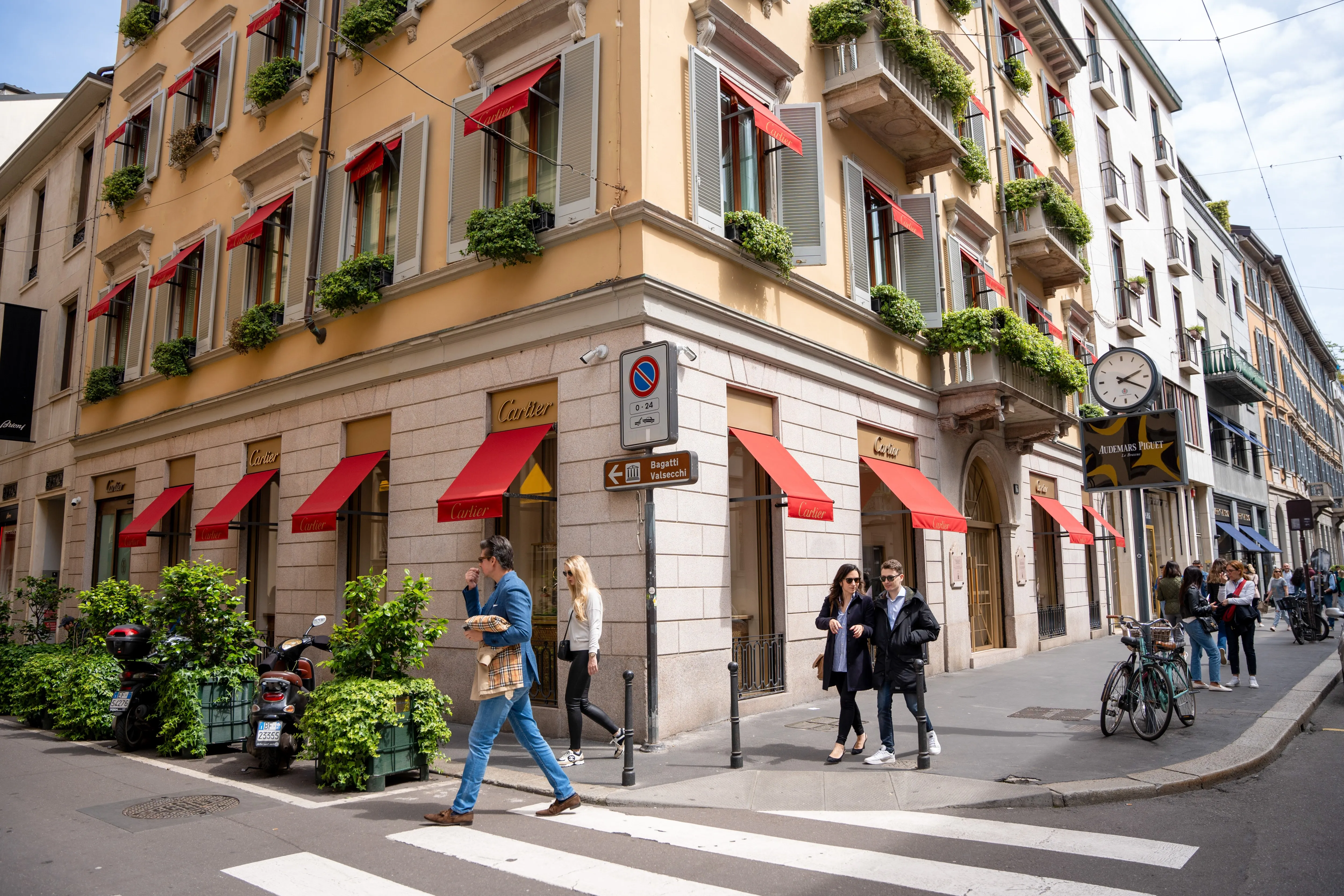 A luxury Cartier boutique on a bustling street, symbolizing strong demand for high-end jewelry