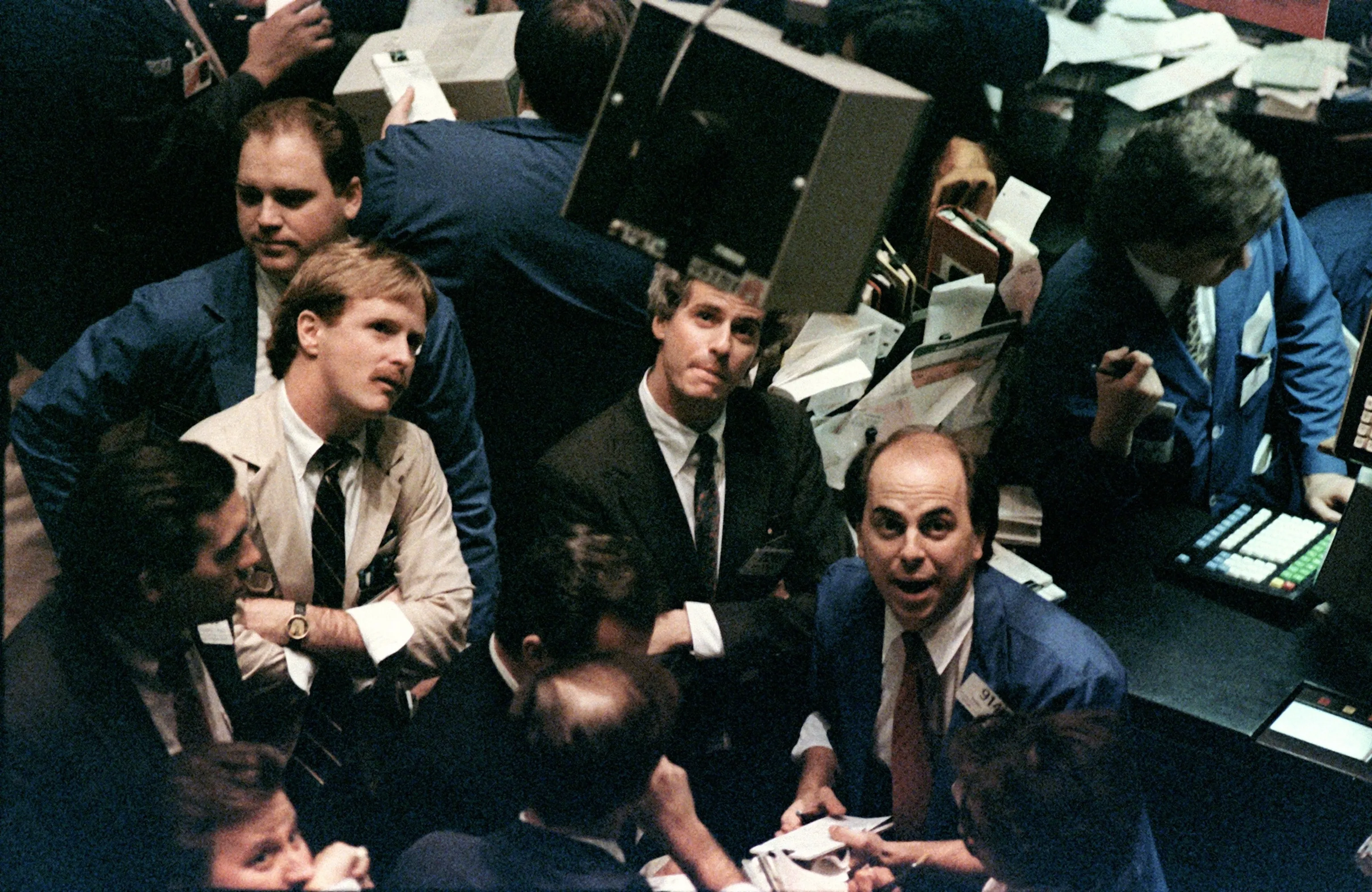 Traders react to rapidly changing stock prices on the NYSE floor during the Black Monday crash of October 1987