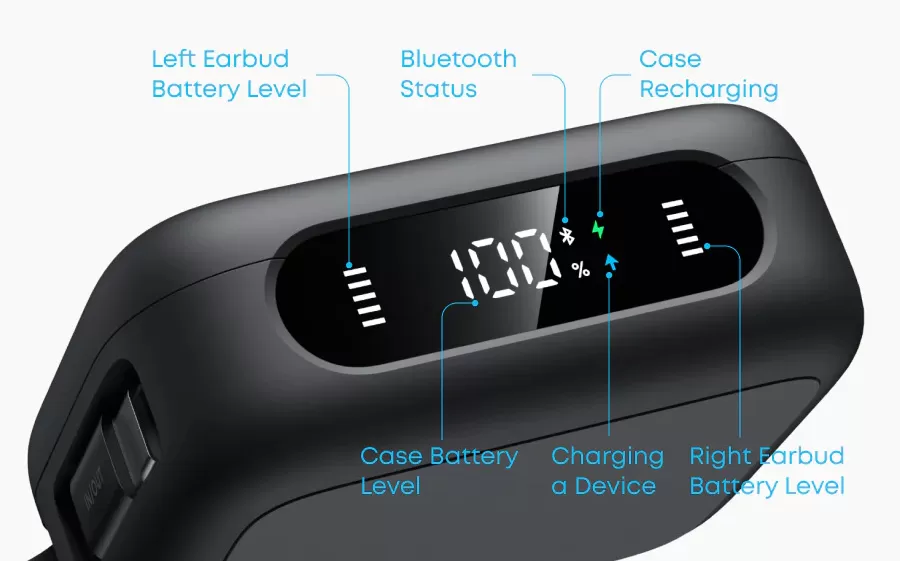 Adding to its utility, the charging case features a status screen. This display shows the remaining battery level of the case as well as the charge status of each individual earbud when they are inside.