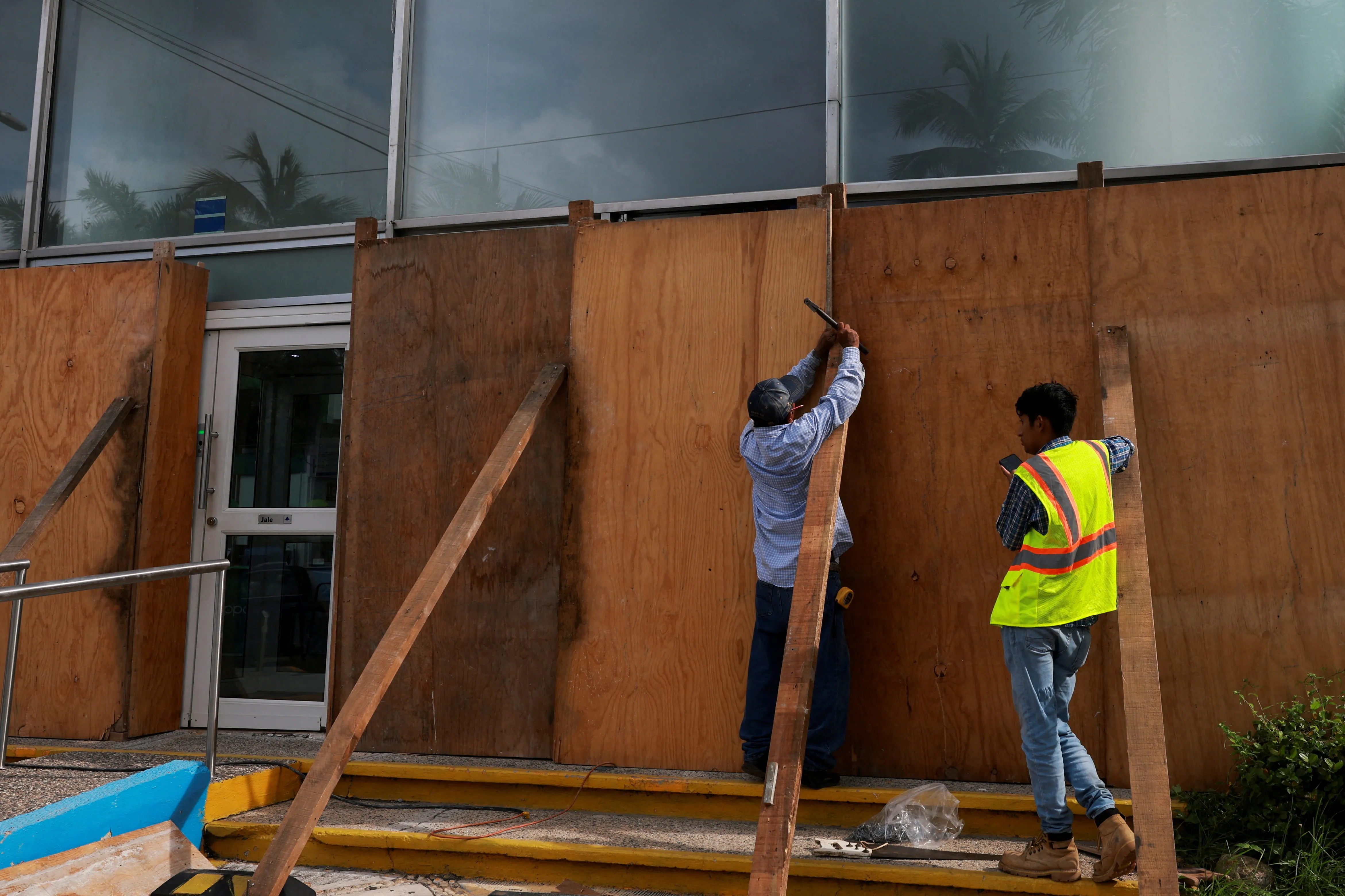 Workers board up windows on a business in Acapulco preparing for Hurricane Erick.