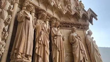 Intricate stone carvings on the facade of the cathedral in Reims, France, a stop on the luxury train journey.