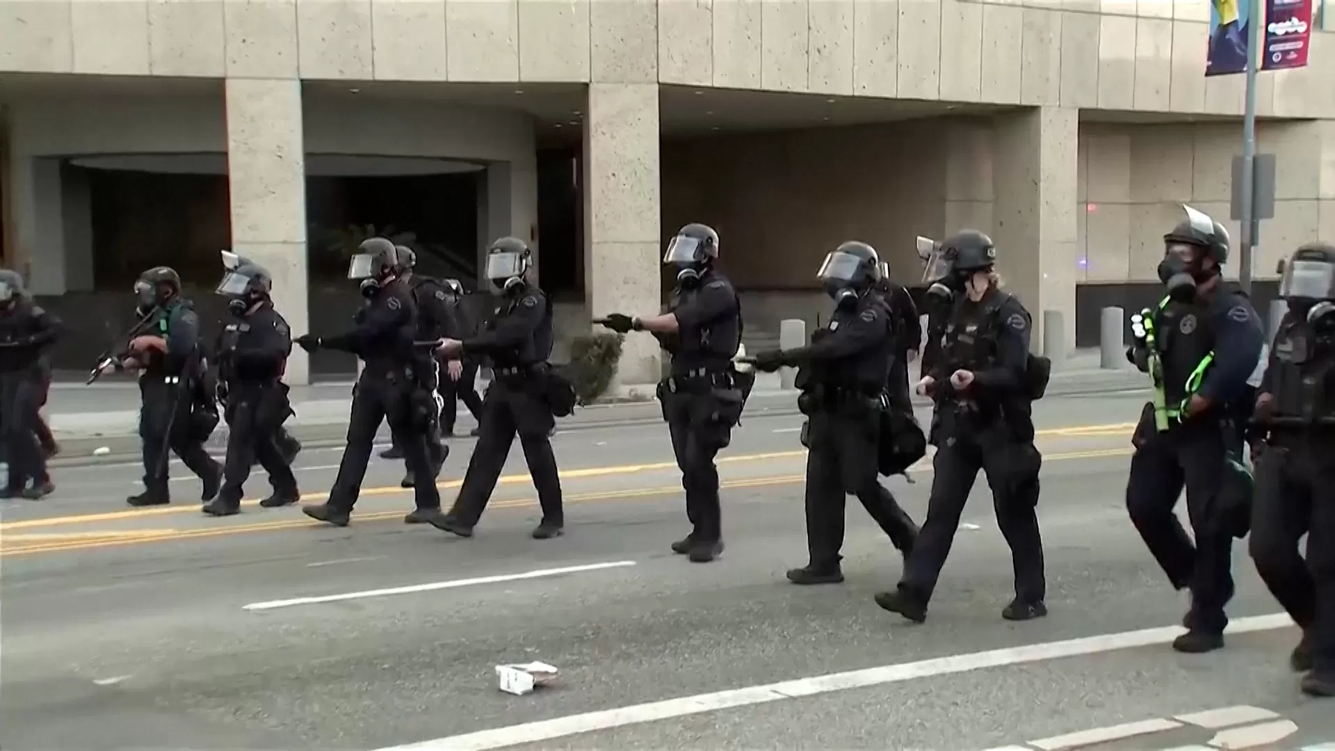 In Paramount on Saturday, federal agents established a staging area near a Home Depot. Demonstrators attempted to impede border patrol vehicles, with some throwing objects like rocks and concrete. Federal agents in riot gear responded by deploying tear gas, flash-bang explosives, and pepper balls against the crowd.