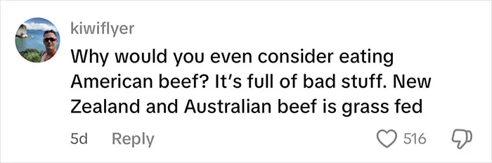 Social media comment compares American beef to grass-fed beef from New Zealand and Australia.