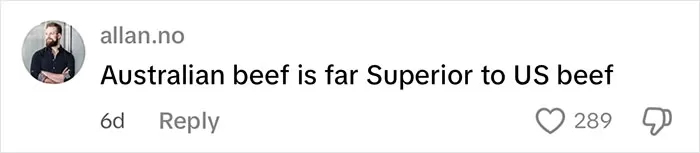 A social media user comments that Australian beef quality is superior to American beef.